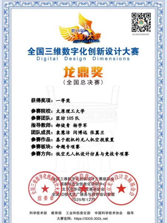 在2025年12月14日和15日,第18届全国三维数字化创新设计大赛(简称“3D大赛”)低空无人机设计仿真与竞技专项赛全国总决赛在杭州市北京航空航天大学国际创新研究院成功举办。作为入选全国普通高校大学生竞赛排行榜的重要赛事,本次专项赛以“数智低空,飞创未来”为主题,聚焦低空经济产业创新与应用场景落地,吸引了来自清华大学、北京航空航天大学、哈尔滨工业大学、西北工业大学、大连理工大学、吉林大学、华南理工大学、武汉理工大学、太原理工大学等全国109支高校参赛团队同台竞技。在创新创业学院(工程训练中心)党政领导的高度重视与统筹支持下,在指导教师郝俊青和杨学军两位老师的精心指导和参赛学生袁慧洁(机械工程学院-机械H2303)、闫博远(机械工程学院-机械H2304)、张翼兰(地球科学与测绘学院-地质2402)的共同努力下,我校代表队成功获得全国总决赛一等奖。